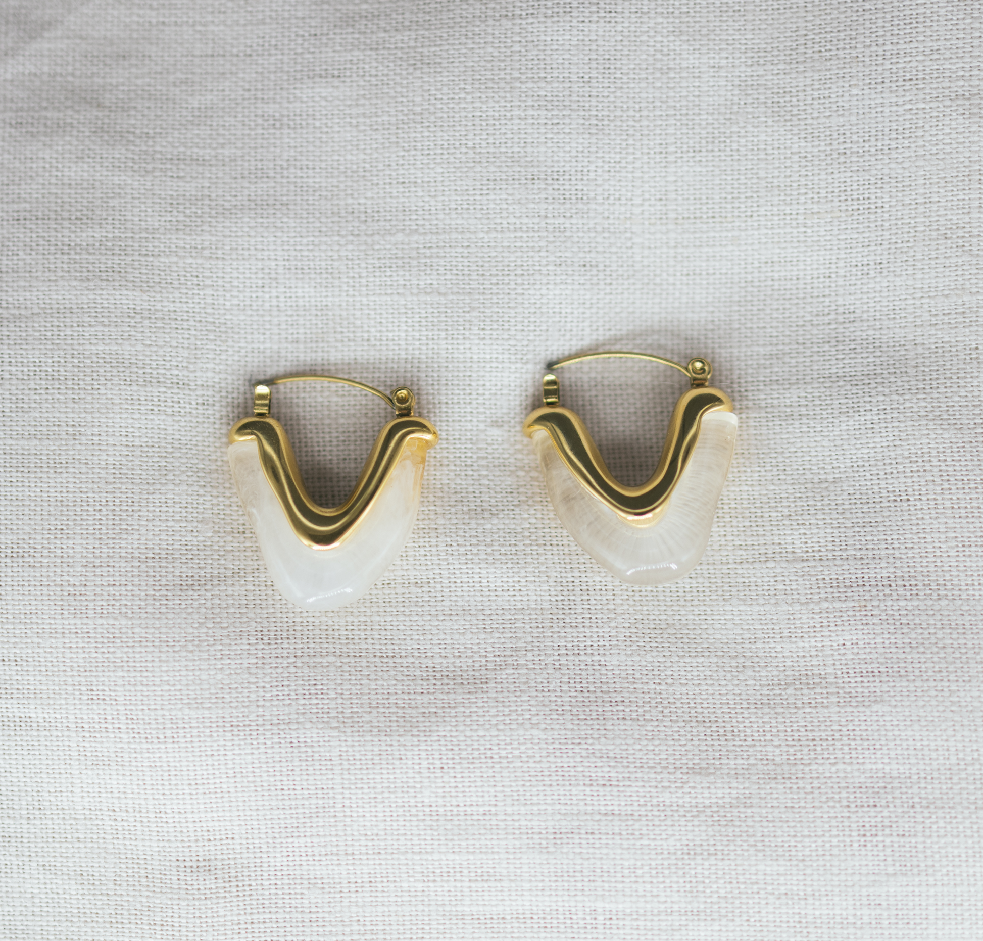A flash of clarity meets warm gold in the Golden Glow Hoops. The clear acrylic panels within the sleek V-shape design add modern brightness, while 18K gold plating and polished edges impart subtle elegance that elevates both casual days and special moments.
